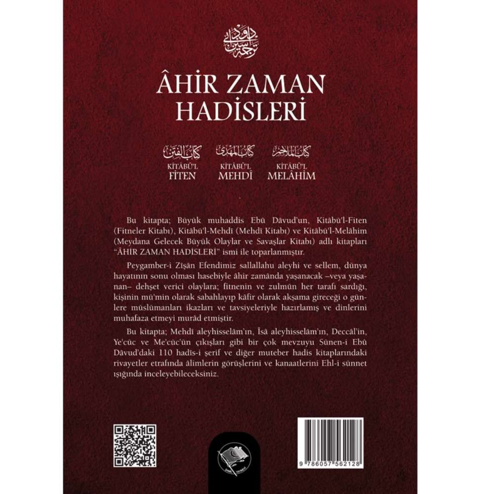 Bu kitapta; büyük muhaddis Ebû Dâvud’un, Sünen’indeki Kitâbü’l-Fiten (Fitneler Kitabı), Kitâbü'l-Mehdî (Mehdi Kitabı) ve Kitâbü'l-Melâhim (Meydana Gelecek Büyük Olaylar ve Savaşlar Kitabı) adlı kitapları “ÂHİR ZAMAN HADİSLERİ” ismi ile ... (devamı açıklama kısmında.▼)