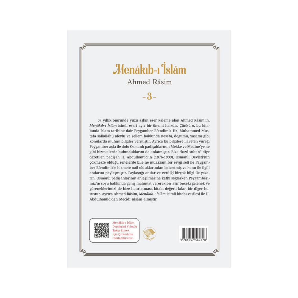 67 yıllık ömründe yüzü aşkın eser kaleme alan Ahmed Râsim’in, Menâkıb-ı İslâm isimli eseri ayrı bir önemi haizdir. Çünkü o, bu kitabında İslam tarihine dair Peygamber Efendimiz Hz. Muhammed Mustafa sallallâhu aleyhi ve sellem hakkında nesebi, doğumu, yaşamı gibi konularda mühim bilgiler vermiştir. Ayrıca bu bilgilere ilaveten yüreği Peygamber aşkı ile dolu Osmanlı padişahlarının Mekke ve Medine’ye ne gibi hizmetlerde bulunduklarını da anlatmıştır. Bize “kızıl sultan” diye öğretilen padişah II. Abdülhamîd’in (1876-1909), Osmanlı Devleti’nin çökmekte olduğu senelerde bile ne muazzam bir sevgi seli ile Peygamber Efendimiz’e hizmete nail olduklarından bahsetmiş ve konu ile ilgili anılarını paylaşmıştır. Paylaştığı anılar ve verdiği birçok bilgi ile yazarın, Osmanlı padişahlarının anlaşılmasına katkı sağlarken Peygamberimiz’in soyu hakkında geniş malumat vererek bir asır önceki gelenek ve göreneklerimizi de bize hatırlatması, kitabı değerli kılan bir dîger husustur. Ayrıca Ahmed Râsim, Menâkıb-ı İslâm isimli kitabı vesilesi ile II. Abdülhamîd’den Mecîdî nişânı almıştır.