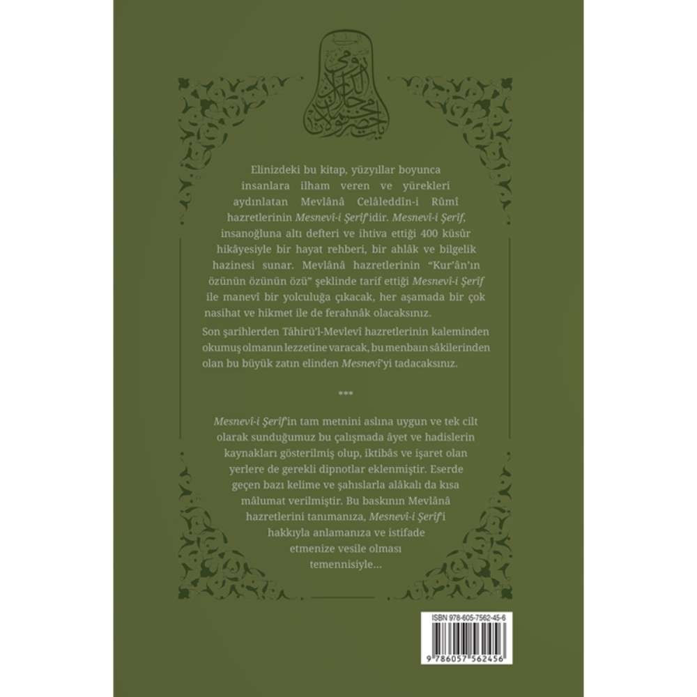 Mesnevî-i Şerîf’in tam metnini aslına uygun ve tek cilt olarak sunduğumuz bu çalışma Tâhirü’l-Mevlevî’nin Mesnevî Şerhi adlı eserinden beyit tercümeleri alınarak hazırlanmıştır. Bunula beraber âyet ve hadislerin kaynakları gösterilmiş olup, iktibâs ve işaret olan yerlere de gerekli dipnotlar eklenmiştir. Eserde geçen bazı kelime ve şahıslarla alâkalı da kısa mâlumat verilmiştir. Bu baskının Mevlânâ hazretlerini tanımanıza, Mesnevî-i Şerîf’i hakkıyla anlamanıza ve istifade etmenize vesile olması temennisiyle…