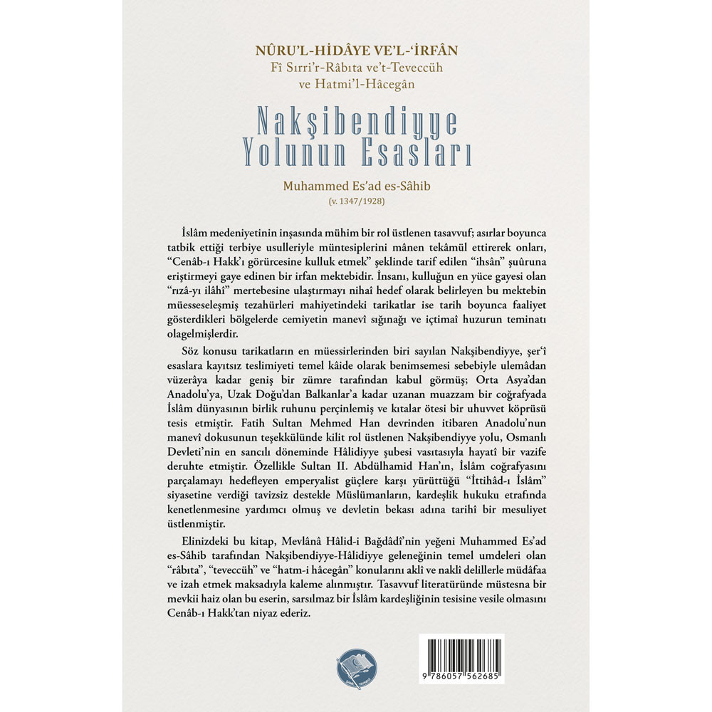 Elinizdeki bu kitap, Mevlânâ Hâlid-i Bağdâdî’nin yeğeni Muhammed Es’ad es-Sâhib tarafından Nakşibendiyye-Hâlidiyye geleneğinin temel umdeleri olan “râbıta”, “teveccüh” ve “hatm-i hâcegân” konularını aklî ve naklî delillerle müdâfaa ve izah etmek maksadıyla kaleme alınmıştır. Tasavvuf literatüründe müstesna bir mevkii haiz olan bu eserin, sarsılmaz bir İslâm kardeşliğinin tesisine vesile olmasını Cenâb-ı Hakk’tan niyaz ederiz.