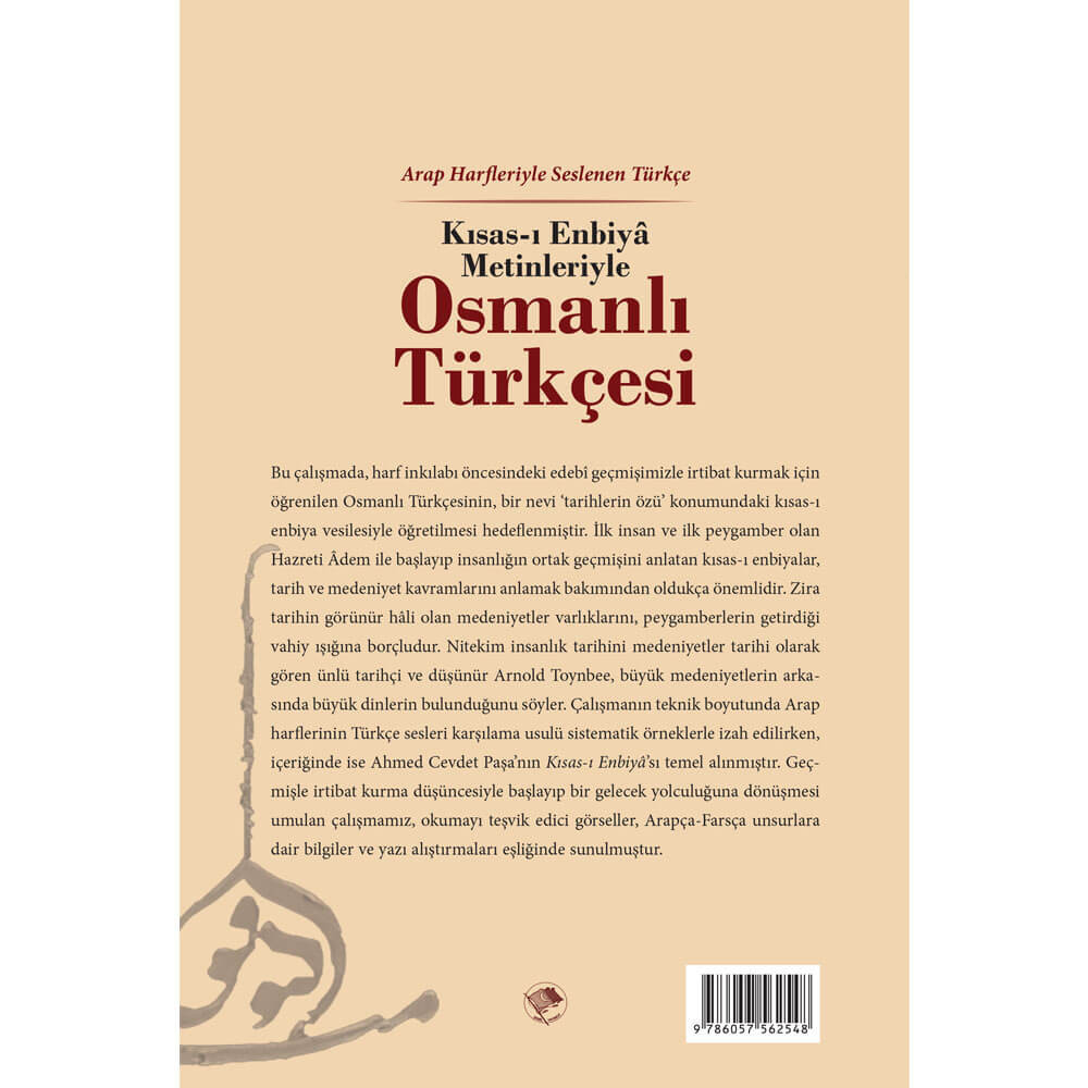Bu çalışmada, harf inkılabı öncesindeki edebî geçmişimizle irtibat kurmak için öğrenilen Osmanlı Türkçesinin, bir nevi ‘tarihlerin özü’ konumundaki kısas-ı enbiya vesilesiyle öğretilmesi hedeflenmiştir. İlk insan ve ilk peygamber olan Hazreti Âdem ile başlayıp insanlığın ortak geçmişini anlatan kısas-ı enbiyalar, tarih ve medeniyet kavramlarını anlamak bakımından oldukça önemlidir. Zira tarihin görünür hâli olan medeniyetler varlıklarını, peygamberlerin getirdiği vahiy ışığına borçludur. Nite-kim insanlık tarihini medeniyetler tarihi olarak gören ünlü tarihçi ve düşünür Arnold Toynbee, büyük medeniyetlerin arkasında büyük dinlerin bulunduğunu söyler. Çalışmanın teknik boyutunda Arap harflerinin Türkçe sesleri karşılama usulü sistematik örneklerle izah edilirken, içeriğinde ise Ahmed Cevdet Paşa’nın Kısas-ı Enbiyâ’sı temel alınmıştır. Geçmişle irtibat kurma düşüncesiyle başlayıp bir gelecek yolculuğuna dönüşmesi umulan çalışmamız, okumayı teşvik edici görseller, Arapça-Farsça unsurlara dair bilgiler ve yazı alıştırmaları eşliğinde sunulmuştur.